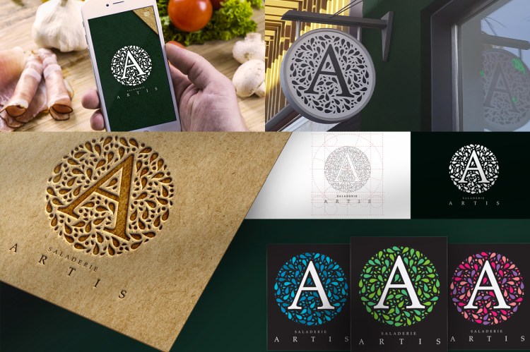 L’identité visuelle s’appuie sur l’initiale A, en typographie serif très élégante, entourée de motifs représentant les éléments composant les plats. L’ensemble constitue une forme arrondie, évoquant une salade, un vitrail ou encore un pissenlit prêt à s’épanouir en différentes couleurs.